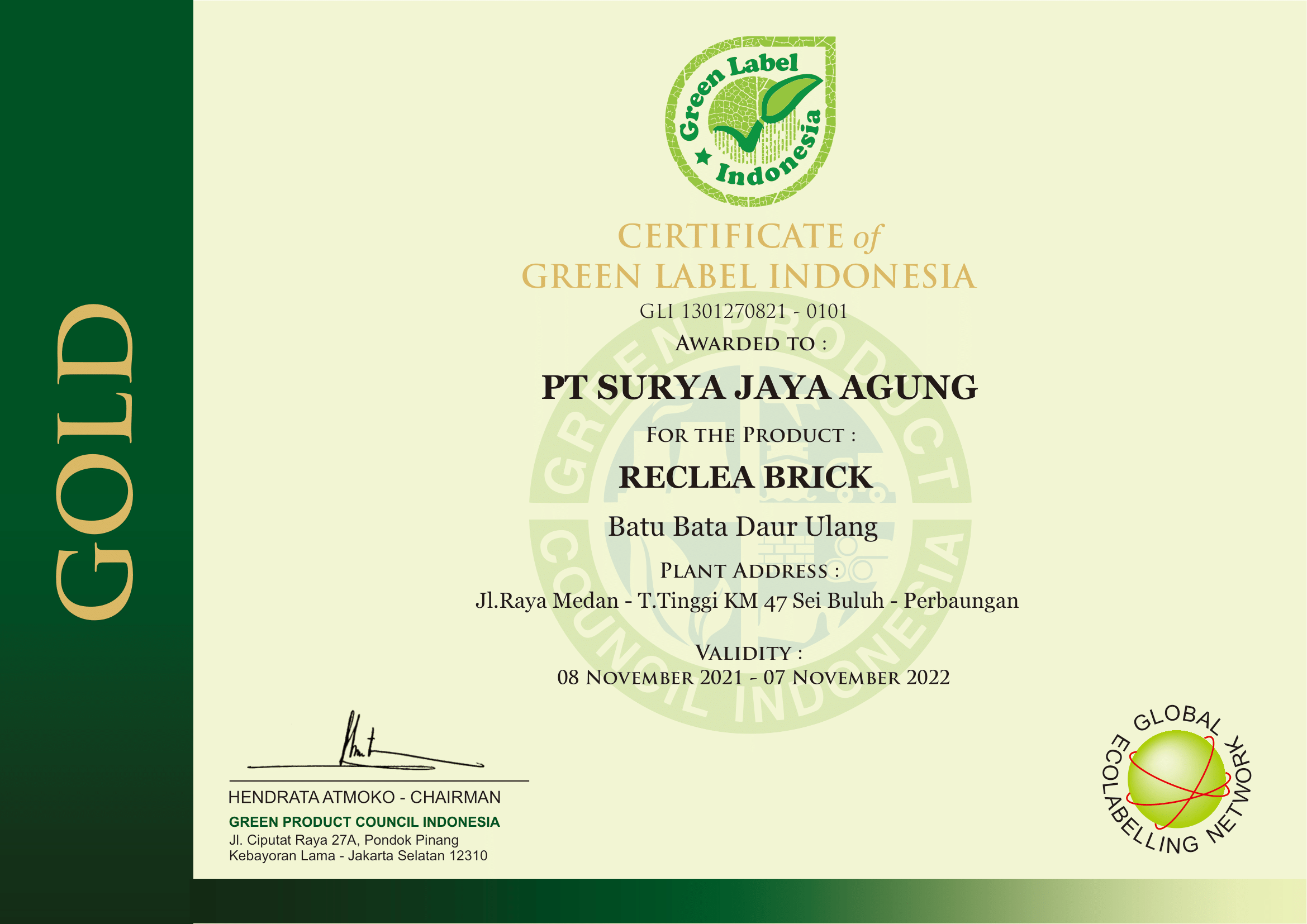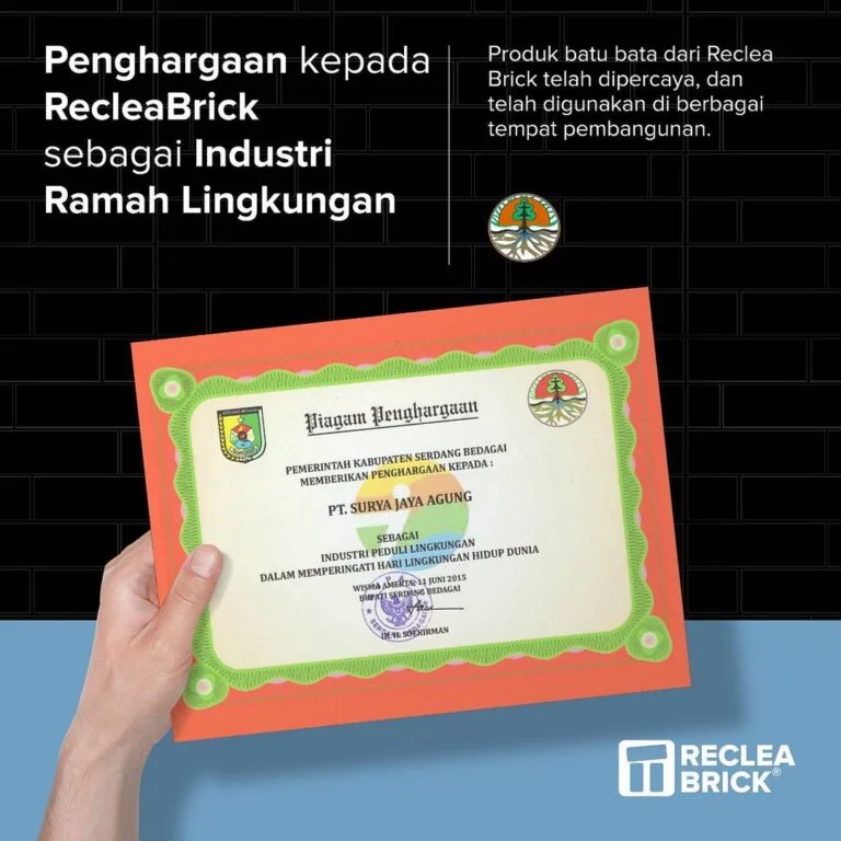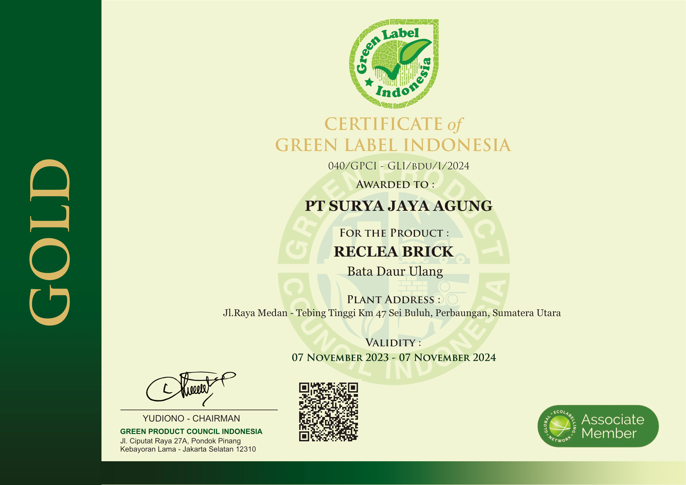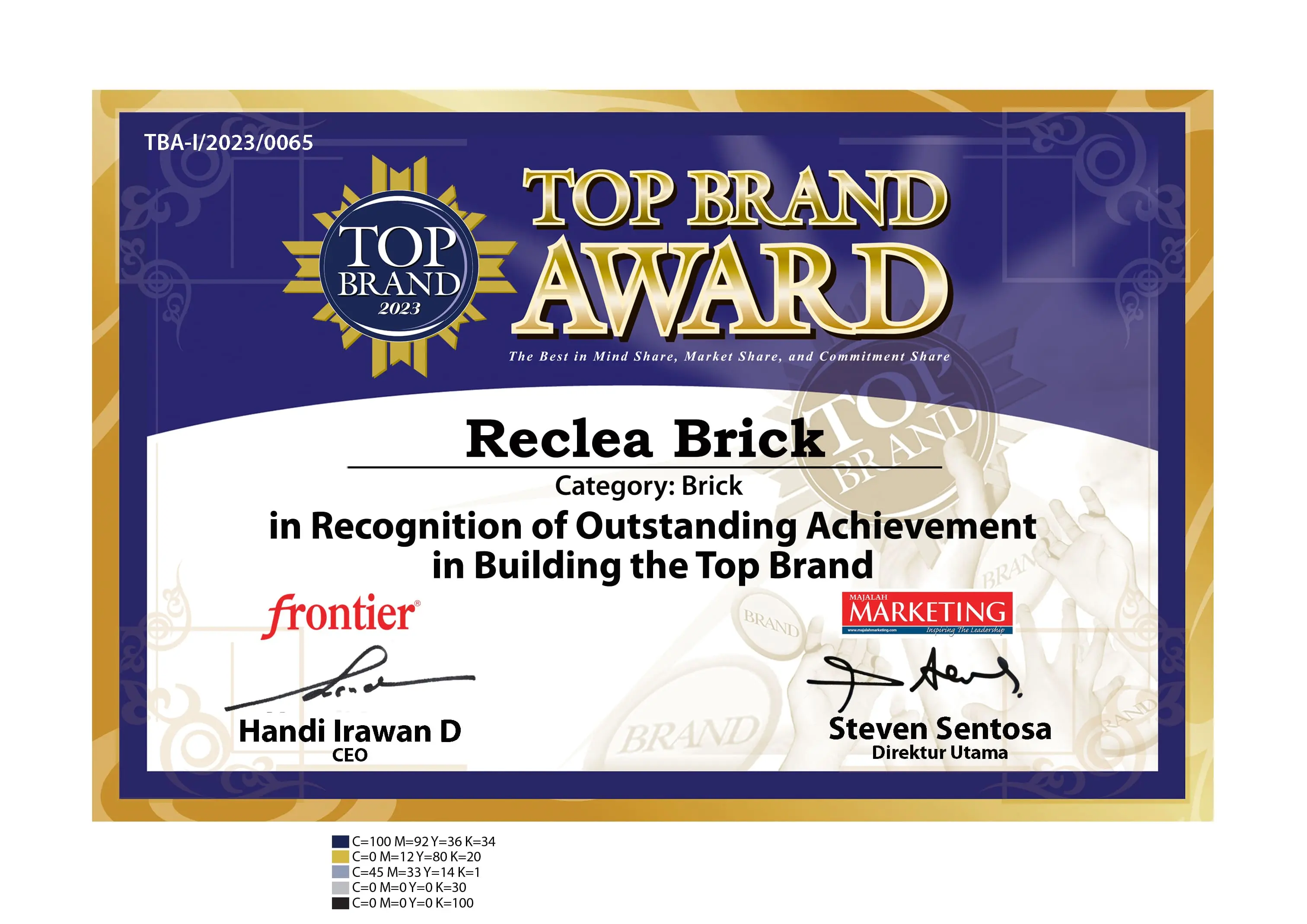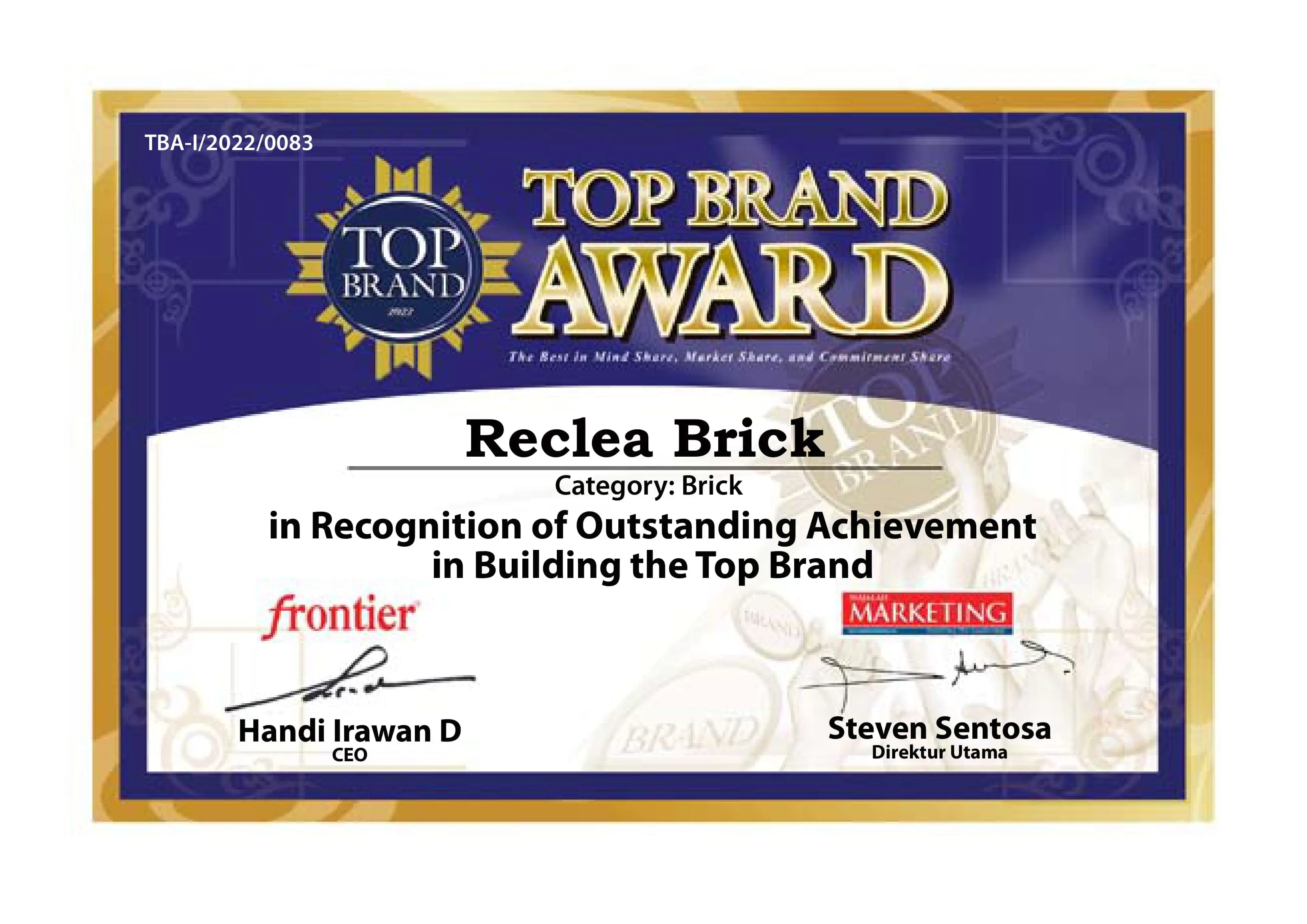 Reclea Brick telah mengantongi Certificate of Green Label Indonesia, lulus uji IAPMO Group Indonesia, mendapatkan anugerah sertifikat TOP BRAND
